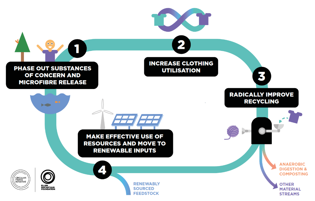 ● تحسين شبكة إعادة تدوير نفايات المنسوجات وتشجيع الشركات ذات العلامات التجارية على زيادة نسبة استخدام الألياف المعاد تدويرها.