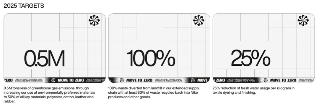 لم تحدد شركة Nike هدفًا للكربون يتمثل في صافي انبعاثات صفرية في عام 2050 فحسب، بل حققت أيضًا هدفها لعام 2025 قبل الموعد المحدد، وهو تقليل 500000 طن من انبعاثات الكربون باستخدام ما لا يقل عن 50% من EPMs في جميع المواد الرئيسية (البوليستر والقطن والجلود والمطاط). إن التدابير مثل زيادة نسبة البوليستر المعاد تدويره في منتجات الأحذية وتحسين المواد الجلدية منخفضة الكربون هي مفتاح التقدم. يُظهر تقرير تأثير Nike للسنة المالية 2023 أن نسبة ألياف البوليستر المعاد تدويرها المستخدمة في منتجات الأحذية والملابس من Nike قد زادت بنسبة 11% مقارنة بالسنة المالية 2022؛ تعمل شركة Converse التابعة لها أيضًا على توسيع استخدام ألياف البوليستر المعاد تدويرها واستبدال مواد البوليستر الخام بالبوليستر المعاد تدويره قدر الإمكان في كل نمط حذاء. زاد استخدام العلامة التجارية لألياف البوليستر المعاد تدويرها بنسبة 91% مقارنة بالعام السابق.